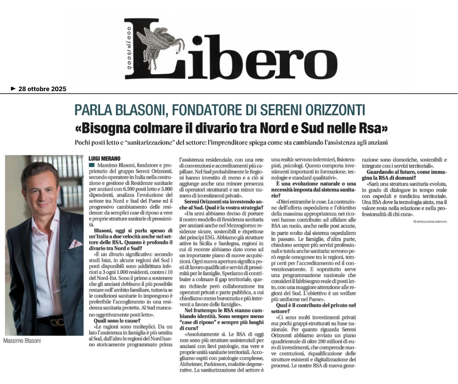 LIBERO: parla Blasoni, fondatore di Sereni Orizzonti: “Bisogna colmare il divario tra Nord e Sud nelle Rsa”